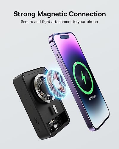 - ✅【Fuerte Fijación Magnética】La función Magsafe permite la alimentación automática sin pulsar manualmente un botón de encendido – para una carga inalámbrica fácil y sin problemas. El imán súper fuerte hace que sea fácil alinear el dispositivo y la batería para que pueda tomar selfies, hacer llamadas y lograr más con una sola mano.