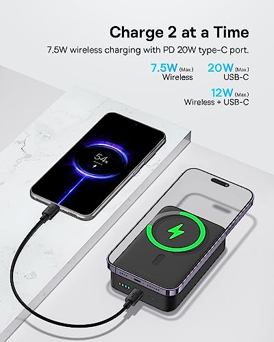- ✅【Diseñado para iPhone 14/13/12 Series】El power bank inalámbrico tiene una almohadilla magnética adaptada para iPhone 14/13/12 series y tiene un conector USB-C compatible con todos los iPhones y otros dispositivos. El conector Tipo-C actualizado admite la entrada PD 20W y la salida 18W y admite la tecnología de paso para que pueda cargar el banco de batería mientras carga el teléfono.