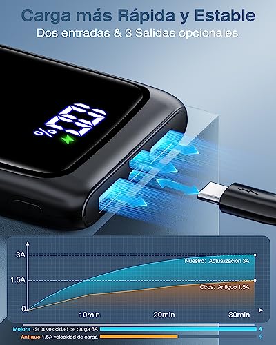 - 🚀【3A Carga Rápida & 3 Salidas】El power bank portátil soporta 5V/3A USB-C de entrada/salida, le ofrece una velocidad de carga más rápida. Con tres salidas (1 Tipo C y 2 USB A), puedes cargar tu teléfono, tableta y auriculares al mismo tiempo para ahorrar tiempo de carga, o compartir con amigos y cargar juntos.