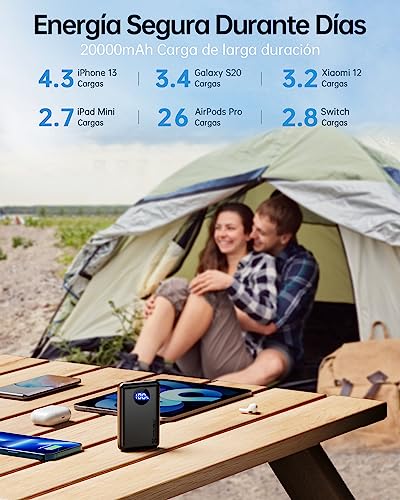 • ✅【Cargador Portátil Pequeño y Potente】El banco de power bank portátil de 20000 mAh más pequeño y liviano del mercado, solo 4.25 * 2.71 * 1.03 pulgadas, 296 g. Perfecto para el uso diario, acampar, viajar y la mayoría de las bolsas, lo que le permite disfrutar fácilmente de un día completo de capacidad de carga. Es suficiente cargar iPhone 12 4,8 veces, Samsung S21 3,4 veces, iPad mini 2,7 veces, etc.