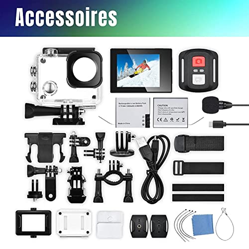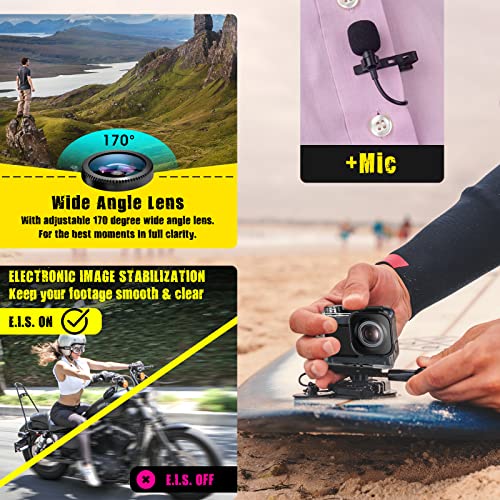 - 🎤【Micrófono externo y ultra gran angular de 170 °】El micrófono externo de la cámara de acción permite un video claro incluso en entornos ruidosos. La lente ultra gran angular de 170 ° permite que la cámara de acción capture imágenes épicas de paisajes o momentos importantes.