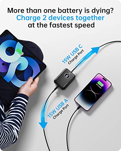- 👍15W Dos Salidas y Pequeño Pero Fuerte👍: Power bank con FAHEFANA nueva generación de tecnología de regulador de voltaje, la corriente de carga es más estable. Actualizado a 15W-max de potencia rápida en los dos puertos de salida. Posee 1 entrada/salida USB-C (5V/3.0A) y 1 salida USB-A (5V/3.0A). Carga fácilmente hasta dos dispositivos al mismo tiempo.