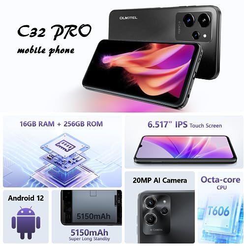 OUKITEL C32 Pro Teléfono Móvil Libres 2023, 16GB RAM+ 256GB ROM/SD 1TB, 6.52» Pantalla Moviles, Batería 5150mAh, Cámara 20MP, Octa-Core 4G Dual SIM Android 12 Smartphone, Fingerprint/Face ID/GPS/OTG