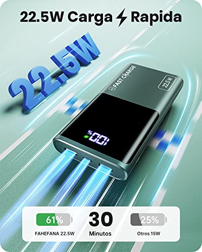 - 👉𝟐𝟐.𝟓𝐖, 𝐦𝐮𝐲 𝐫á𝐩𝐢𝐝𝐨: Equipado con el nuevo chip de FAHEFANA que soporta protocolos de carga rápida como PD3.0 QC4.0 SCP, soportando hasta 22.5W de potencia máxima de salida y 18W de entrada máxima; puede cargar su teléfono hasta el 65% en 30 minutos; y la nueva tecnología de estabilización de corriente y voltaje FA 2.0 proporciona un suministro más estable de corriente y voltaje durante la carga rápida.