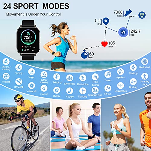 • Multifuncional Smartwatch y Notificación de Mensaje: Reloj inteligente mujer hombre proporciona una serie de funciones íntimas: Pulsera de actividad (podómetro, calorías), monitor de frecuencia cardíaca, monitoreo del sueño, Presión Arterial y Oxigeno en Sangre, 24 modos de deporte, mensajes SMS y APP(WhatsAPP, Facebook, Messenger, Instagram…), control remoto de música y cámaras, pronóstico del tiempo, recordatorio sedentario, alarma, cronómetro, encontrar teléfono, ajuste de brillo, etc.
