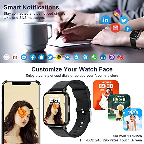 • 1.69″ Pantalla Táctil Completa y Esfera Personalizada: El reloj hombre mujer viene con una pantalla TFT-LCD de 1.69 pulgadas que proporciona una profundidad de color increíble y una claridad excepcional. Después de conectarse con su teléfono, puede elegir entre más de 100 pantallas de reloj o elegir su foto para configurarla como fondo de pantalla. La resolución de 240 * 295 y el brillo de la pantalla ajustable hacen que el smartwatch mujer hombre sea fácil de leer bajo el sol.
