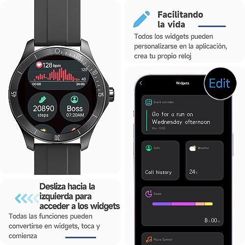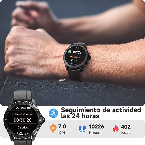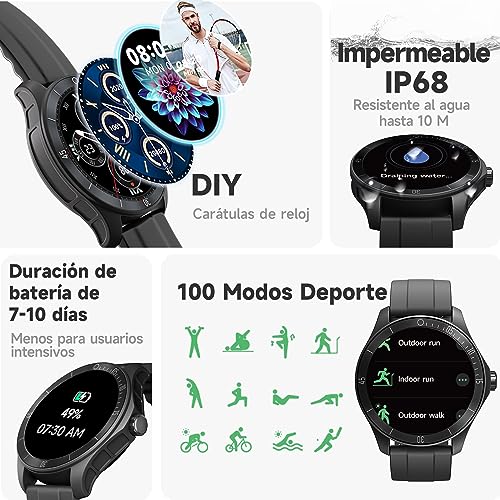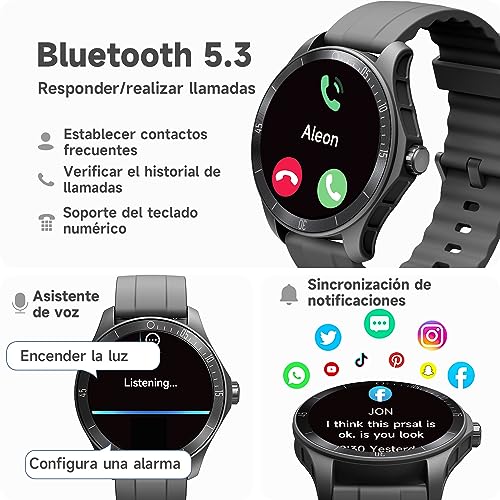 - [Mantente conectado mientras estás en movimiento] reloj inteligente hombre con llamadas y mensajes. Con compatibilidad Bluetooth, el reloj deportivo hombre te permite realizar y recibir llamadas telefónicas, así como recibir notificaciones de redes sociales, correo electrónico y SMS directamente en tu muñeca, nunca perderás un mensaje o notificación importante. Manteniéndote conectado mientras estás en movimiento