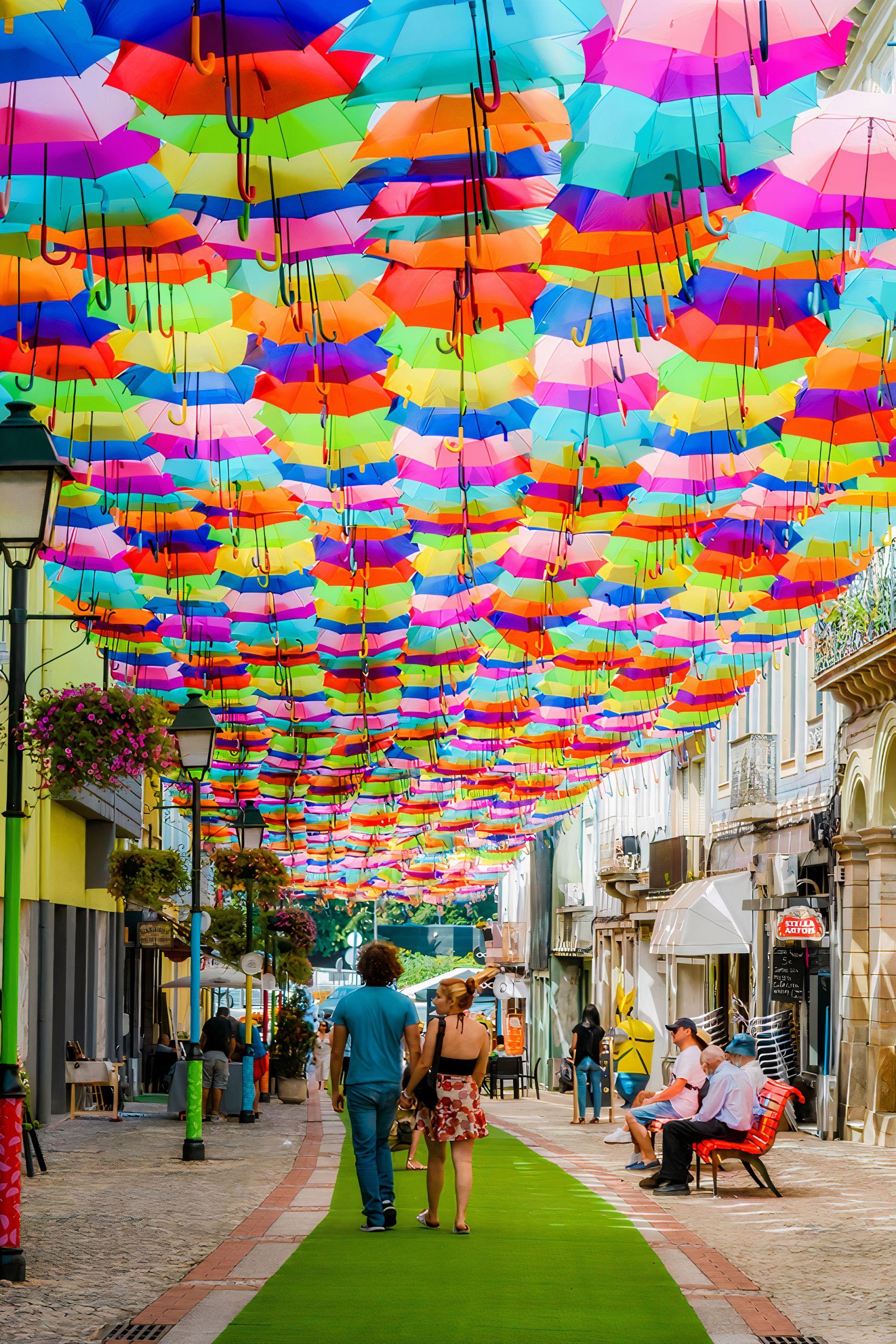 Lo más icónico de Águeda es, sin duda, el Umbrella Sky Project. Cada verano, las calles del centro histórico se llenan de paraguas flotantes que forman un techo de color sobre los transeúntes. Esta instalación no solo da sombra y refresca en los días de calor, sino que también convierte cada rincón en un escenario perfecto para hacer fotos inolvidables.